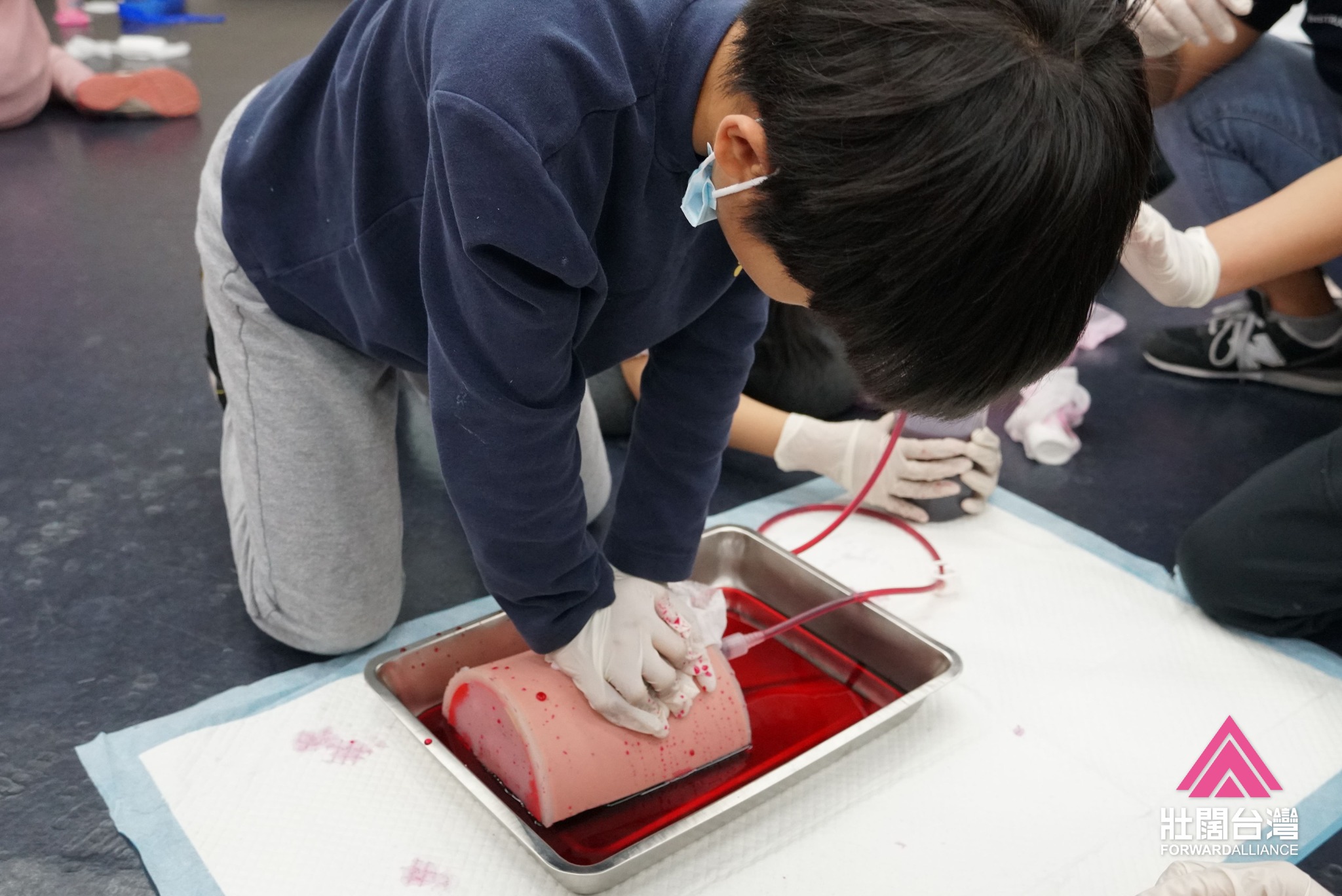 透過我們「救護車司機」(消防員)的引導,紮實的兩個小時裡,孩子們練習直接加壓、填塞止血與止血帶的使用。他們熱情投入,努力成為守護安全的小英雄!